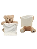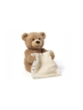 Recites one of six different phrases while animated arms and mouth recreate peek-a-boo game. The bear lift the blanket to hide while talking saying 'you can't see me' and 'where am I' before pulling the blanket down to reveal his face saying 'here I am'